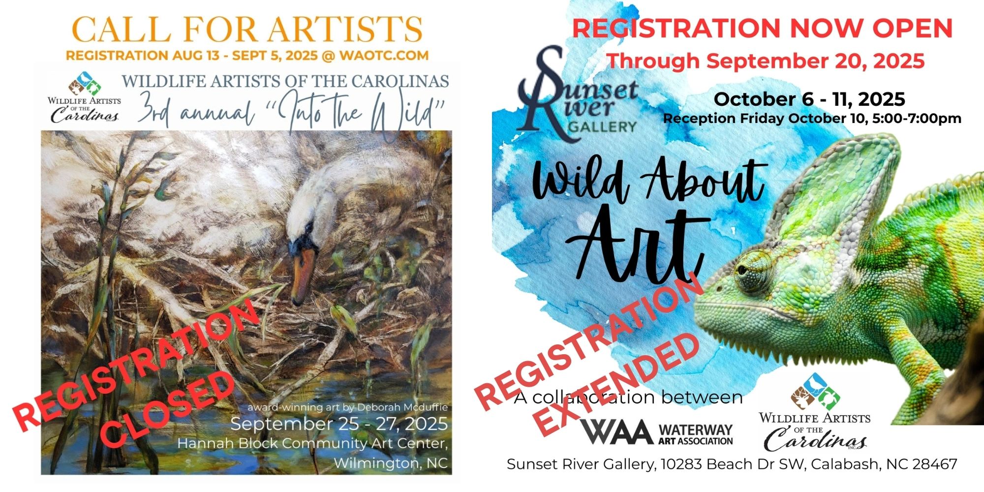 Registration for our 3rd Annual Into the Wild Art Exhibition & Sale is now CLOSED. Registration for Wild About Art, our joint show with the Waterway Art Association has been EXTENDED until September 20. Please review the prospectus before applying.
