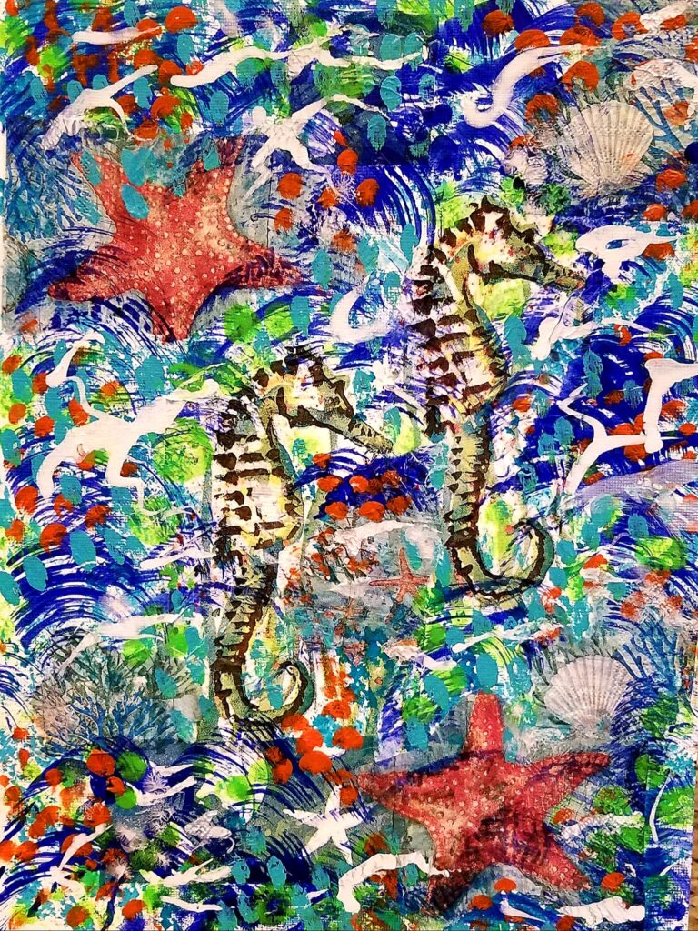 “My paintings emerge out of the pleasure of the painting process. There is usually very little planning.  Experimentation is what excites me as an artist.  The process is a journey and the final art work is always a surprise.  Vibrant color, layered surfaces textures are used to make intriguing, inviting and imaginative abstract art. My body of work includes watercolor, acrylics, mixed media, and collage. I paint in a way to express my joy in the colorful world we live in. For me, painting is mystical and flows naturally from creativeness that links my mind and heart together. The act of joyful and whimsical painting keeps me grounded and grateful for every moment.”